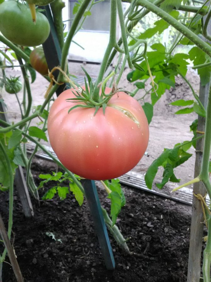 Jag sådde Brandywine fröerna den 30 mars och planterade ut plantorna i växthus den 5-7 juni. Plantorna har ett ganska klent växtsätt, stjälkarna är inte så kraftiga men desto längre och eftersom frukterna är mycket tunga så har jag blivit tvungen att binda upp dem ordentligt. Efter nästan 2 månader i växthus var den första Brandywine fortfarande ljusgrön men fullvuxen.