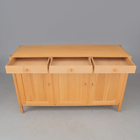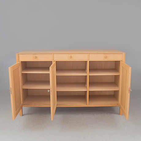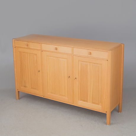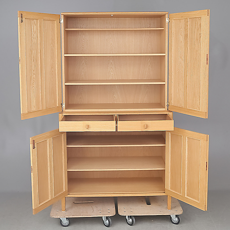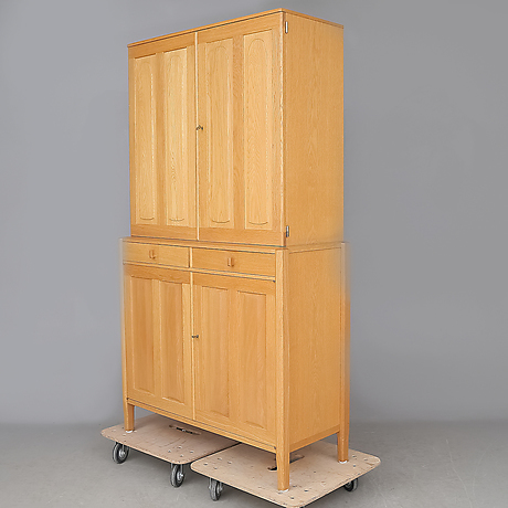 Dörrarna med sina två par-fyllningar i massivt, rakvuxet virke talar om kärv, högrest vila. Underskåpets mellan benstolparna insatta lådparti bildar en sammanhållande horisontal.